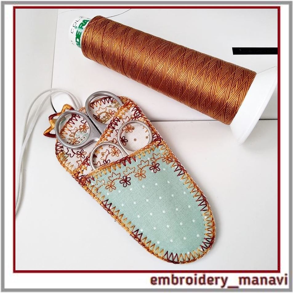 👉 Organize your favorite scissors in style with this beautifully embroidered two-pocket scissors case, crafted as an ITH project (In-the-Hoop) for machine embroidery lovers. Designed for both function and charm, this case project features a delicately embroidered top section and edge finishing with decorative stitching composed of tiny flowers and regal crowns, with the crown motif placed prominently at the upper part of the case.