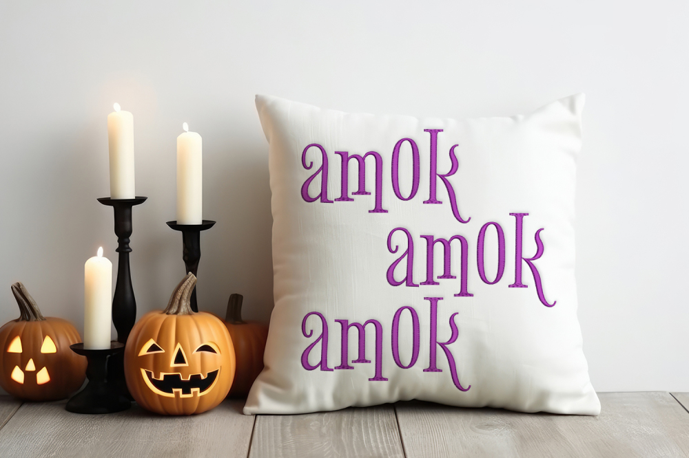 This applique design features the word "amok" in a witchy retro style. Repeat the design for a fun look.