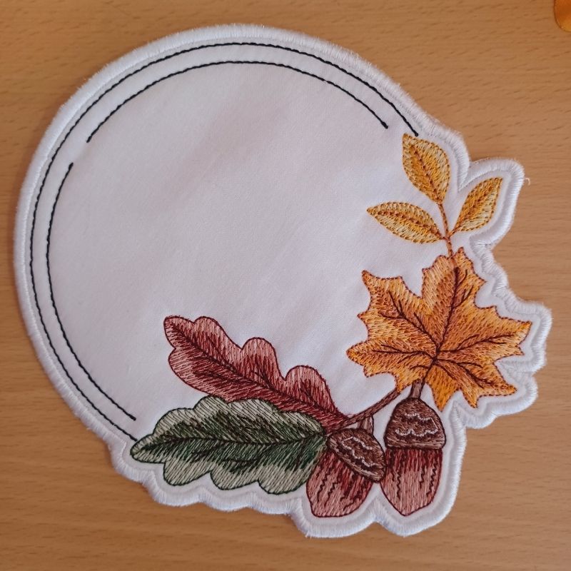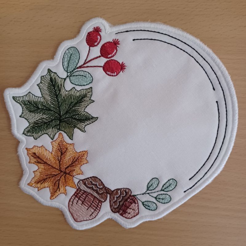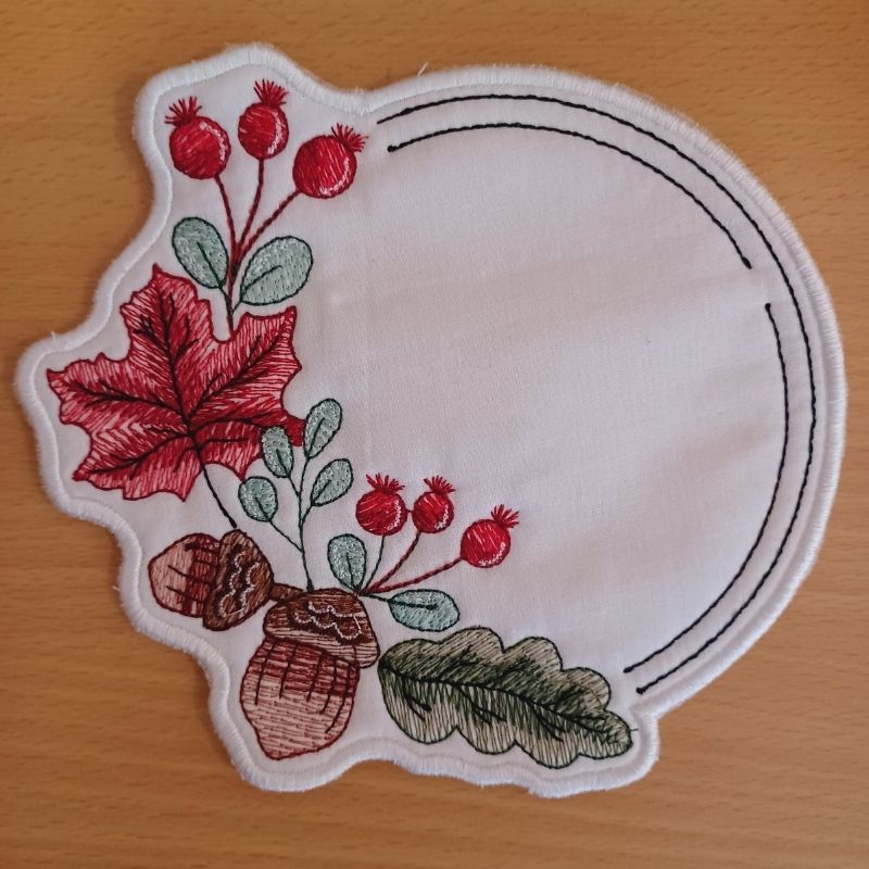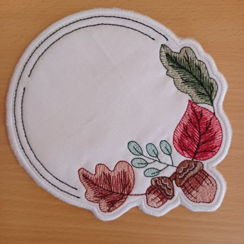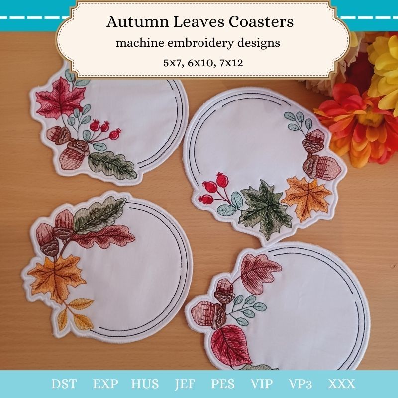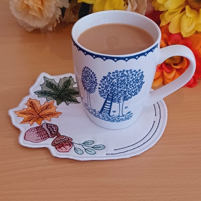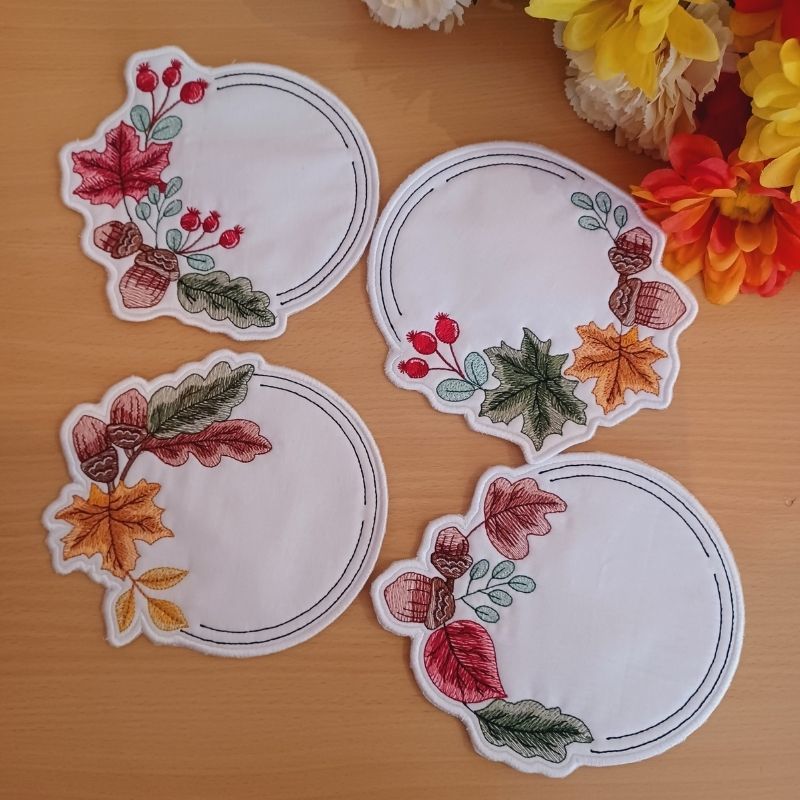 These fun autumn leaves coasters are done with shadings and open stitchwork. The fabric will show through the open stitchwork. Each coaster is made entirely in the hoop.