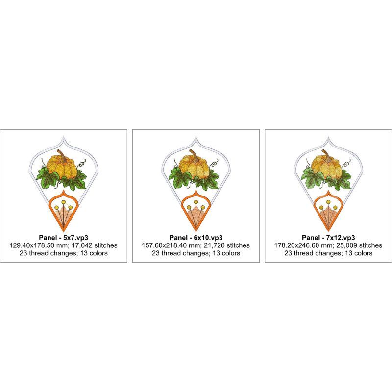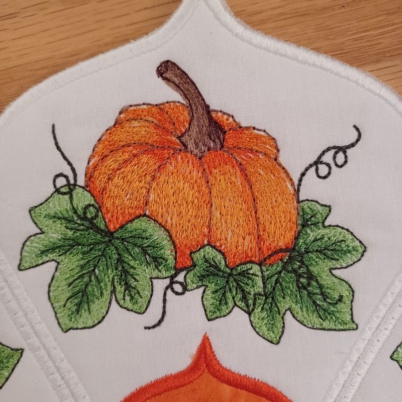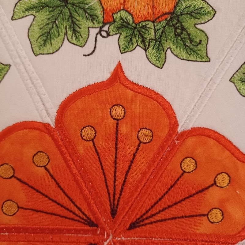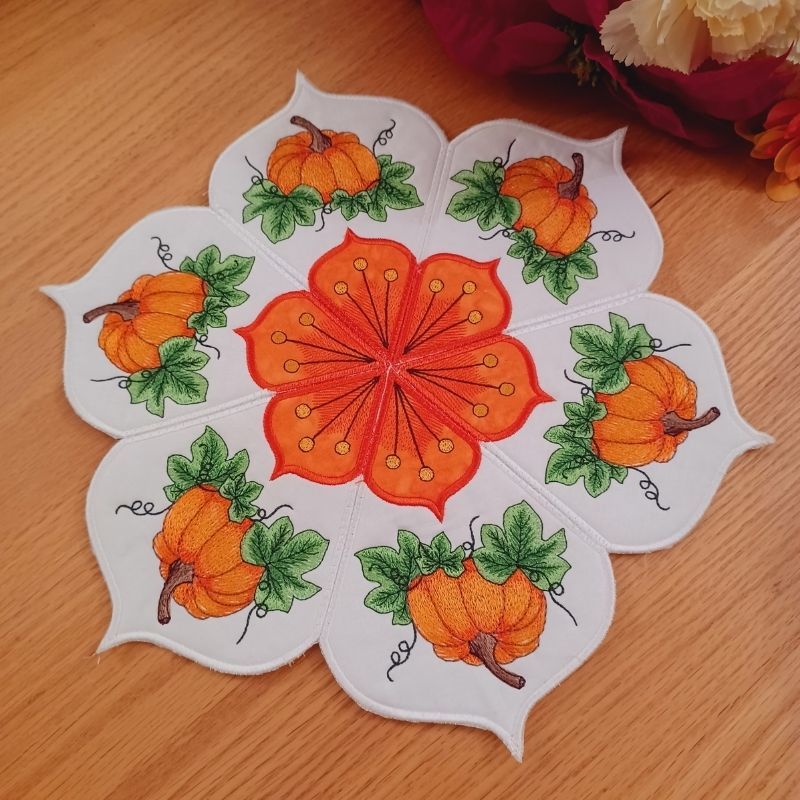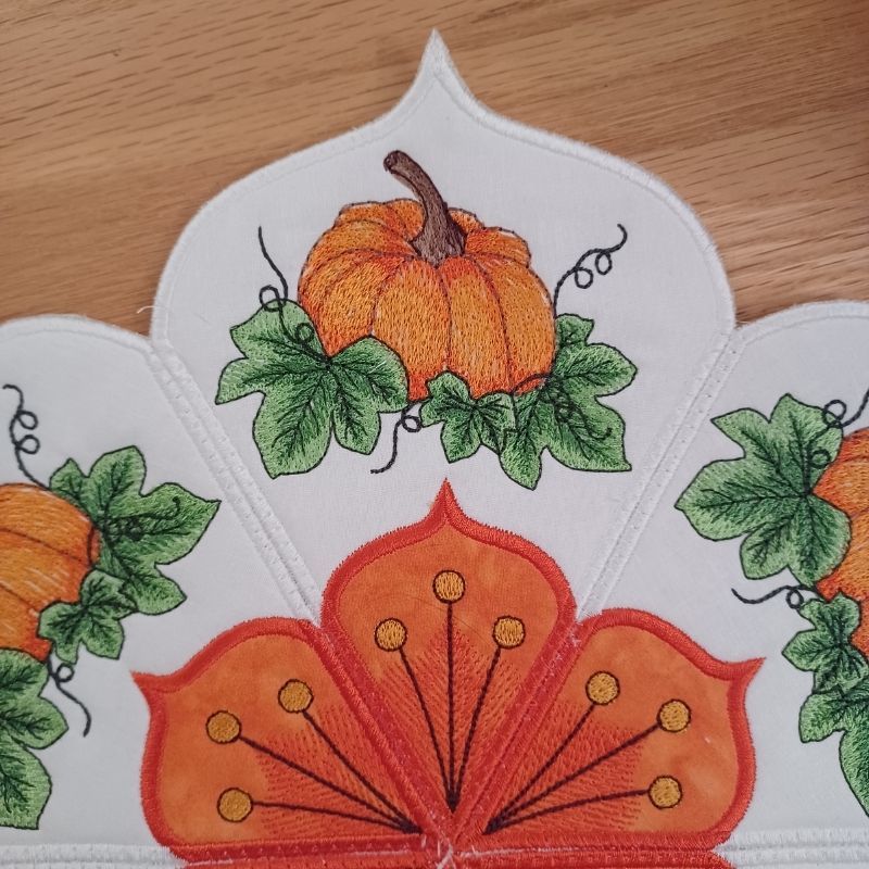This lovely autumn pumpkin table topper is done in the hoop. Each panel and make and lined in the hoop. Joining of the panels is done on a sewing machine.