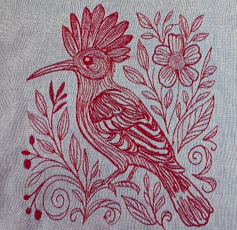 This lively bee-eater perches proudly among blooms, its swirling feathers and crowned crest stitched with attitude. A line embroidery design that brings movement and charm to hoop art, cushions, or tote bags. Stitched in variegated thread, Buzz Catcher dazzles like sunlight glinting on wings mid-flight.