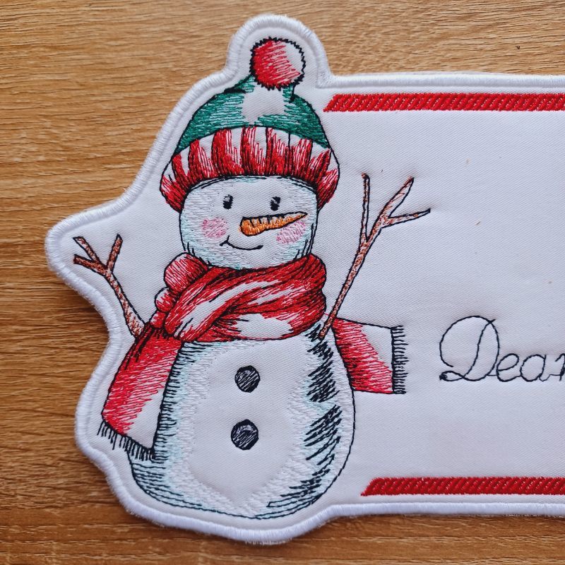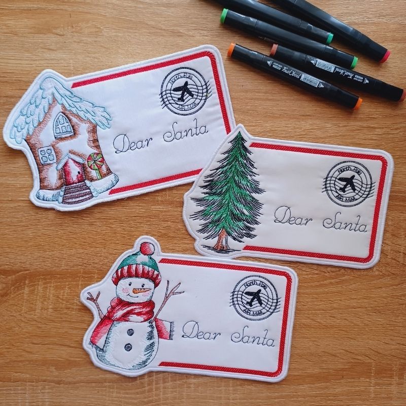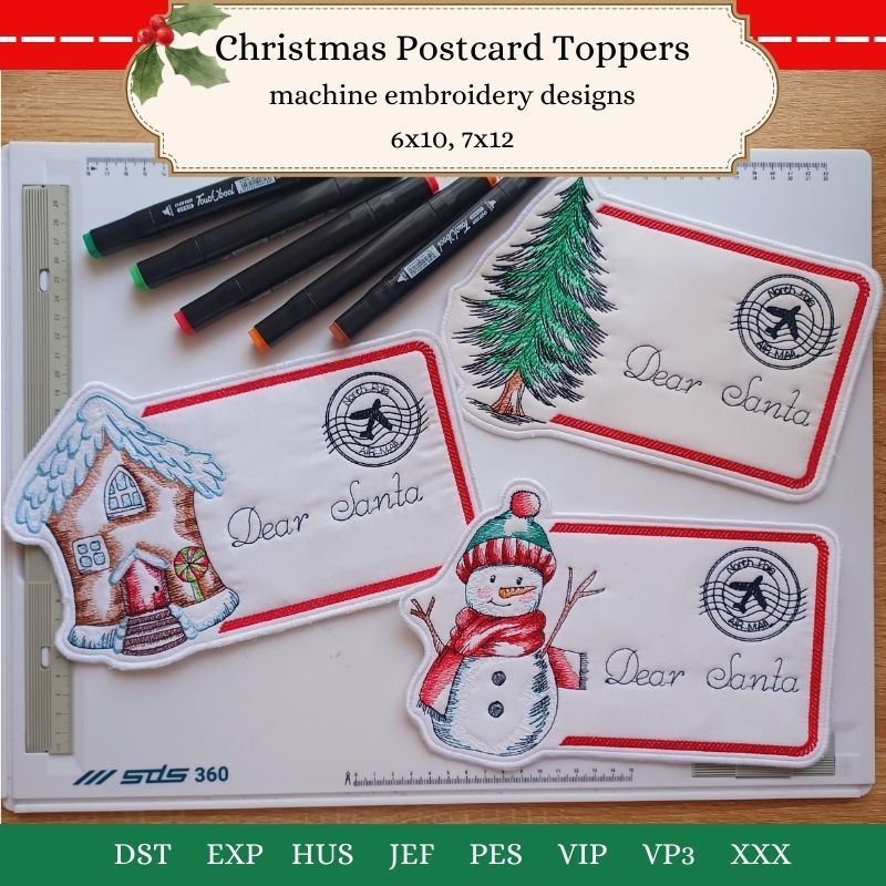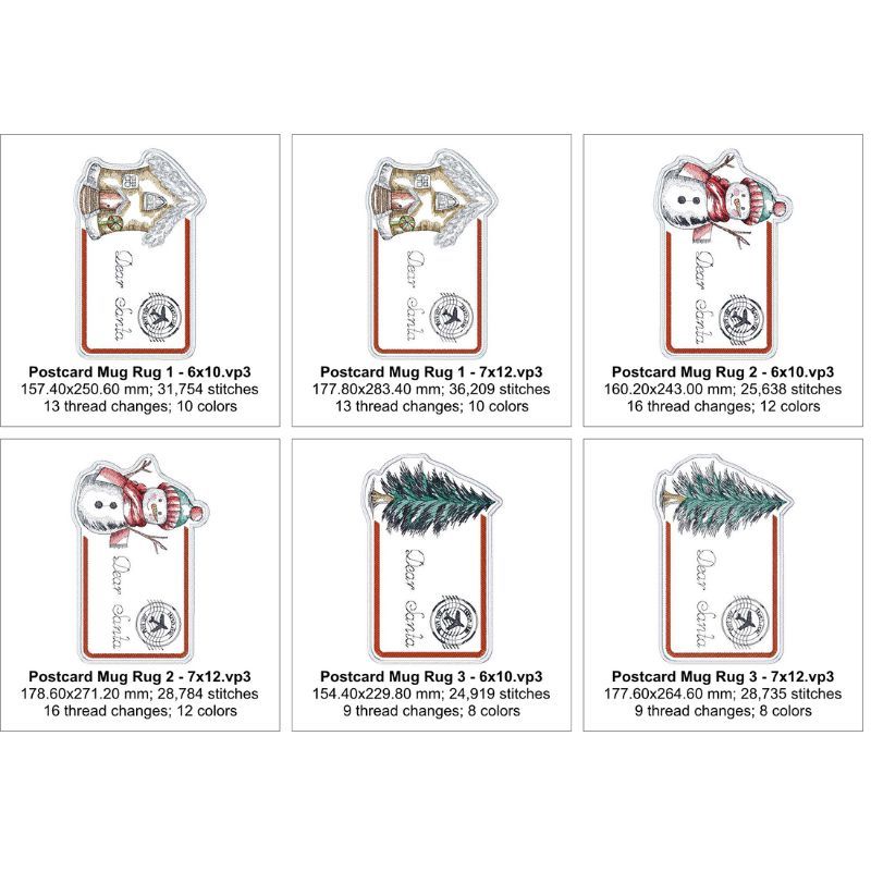 These fun Christmas Postcard Toppers are done in an open sketch embroidery style. The lightweight designs stitch out quickly. These designs are best stitched on plain white fabric. Some fabric will show through the embroidery as these designs are done in an open sketch style. Each topper is made entirely in the hoop. Perfect to use as mug rugs, placemats, large gift tags or even large applique patches for cushions, sweaters or t-shirts.
