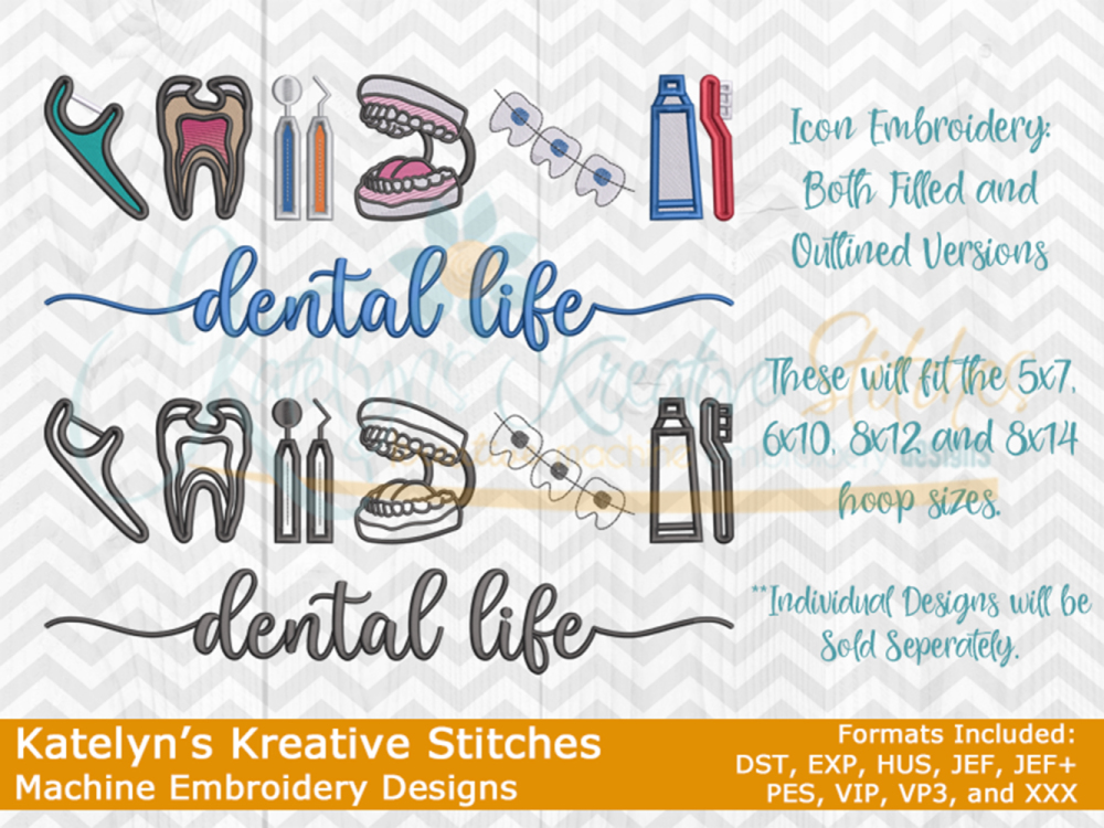 Our Dental Life icon embroidery designs will come in two versions. One will be a multi colored fill stitch and the other will be a single colored satin outline. These designs will fit the 5x7, 6x10, 8x12 and 8x14 hoop sizes. It "does not" include the 4x4 size.