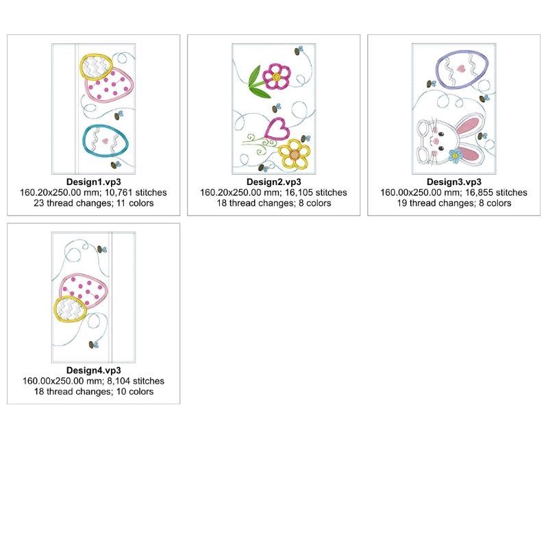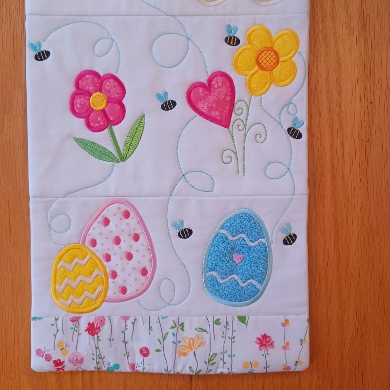 This fun and cute Easter table runner is super easy to make. Each panel is made in the hoop. The bunny, flowers, eggs and heart are all done in applique. Sew and flip technique is used in the top and bottom panels.