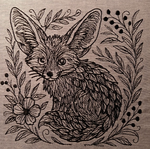 Big ears, bigger attitude this dainty desert fox is framed in a swirl of florals, perfect for adding a dash of wild charm to totes, cushions, or framed hoop art. Try stitching it in variegated thread to make those foxy features pop with playful texture.