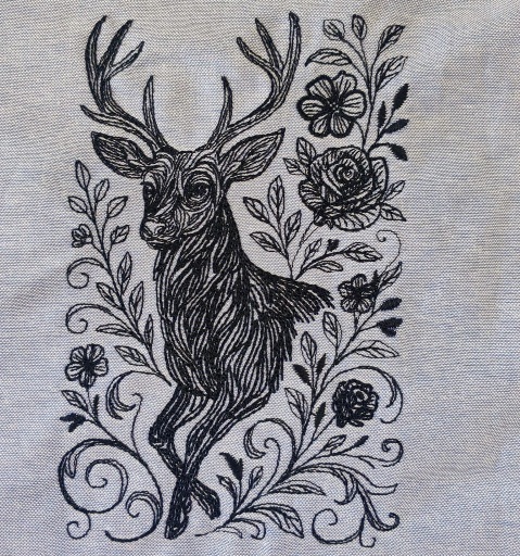 This deer dances through a swirl of blossoms with the elegance of a woodland prince who knows he owns the clearing. With finely detailed fur, graceful antlers, and florals curling around his steps, he brings magical woodland charm to hoop art, cushions, bags, and any project that needs a stitched touch of quiet majestic with just a hint of dramatic flair.