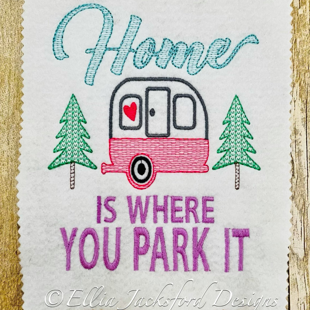 Looking for cute embroidery design that will brighten up all your embroidery projects?  Well try out this Home is Where you Park It sketch embroidery design.  Purchase includes 3 SIZES.  You will receive the 4x4, 5x7 and 6x10 files with purchase.  Quickly and easily add some color to kitchen towels, clothing, or garden flags. See PDF below for sizes.