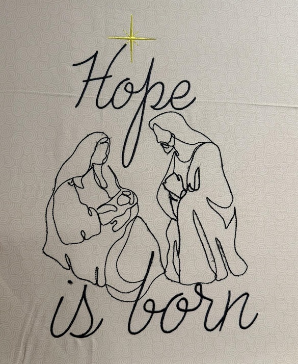 Stunning quick stitch Christmas design of Hope is Born with Mary, Joseph and Baby Jesus in a bean stitch. The North star is a combination of a bean stitch and satin.