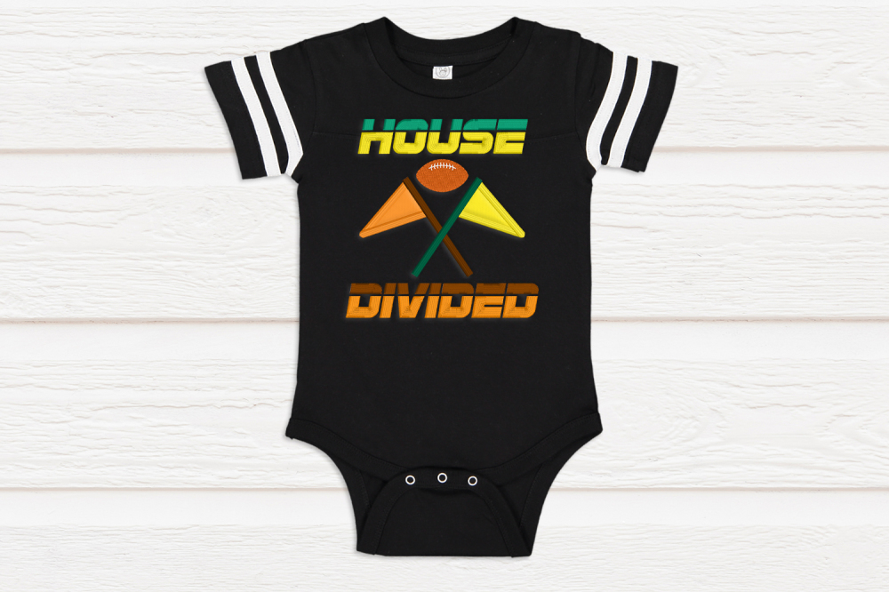 Can't we all just get along? This sports themed design has 2 applique flags with a football and the text "HOUSE DIVIDED." Each word can be done in 2 colors so you can use the colors from your favorite team. The football detail stitches are satin at the largest size and bean stitch at all other sizes.