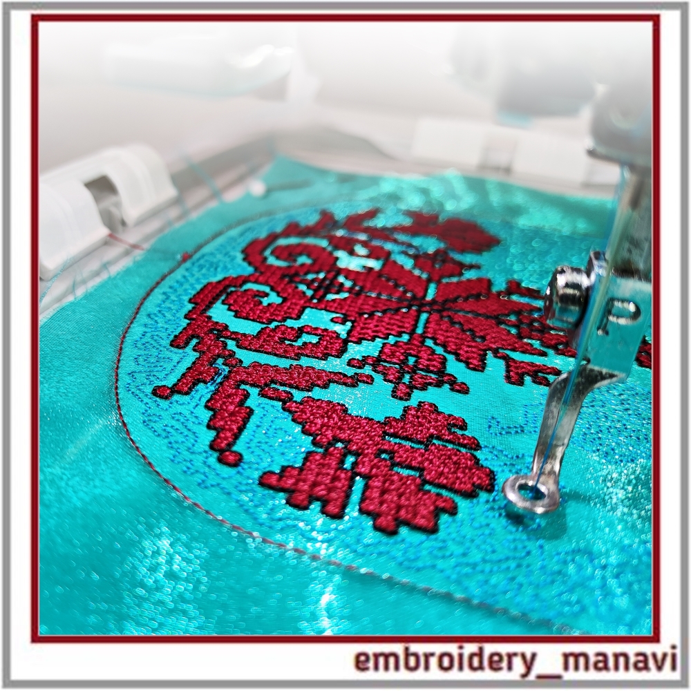 👉Experience the profound energy of Slavic heritage with this intricate ITH necklace design from Embroidery Manavi 05. This is not just a pattern, but a complex sacred composition. At its heart lies the Alatyr Star, the source of all life, which seamlessly grows into the World Tree, symbolizing eternal growth and connection to ancestors. The sides are adorned with Krin flowers, representing health and flourishing, while the S-shaped curves at the base are Bereginya symbols, protecting the wearer’s well-being. Digitized with a realistic French knot effect for a voluminous, artisan texture. Includes a detailed step-by-step video instruction.