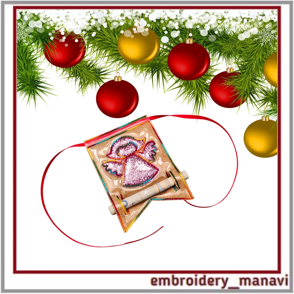 - Digital Design Machine Embroidery. Tutorial. A money flag, a Christmas wallet, a gift pendant or Christmas tree ornament with Applique Angel. Finished size 2.8 x 3.88 (70 x 97 mm). In The Hoop 4x4 embroidery project. May be a good family present. Christmas decoration. ITH embroidery design.