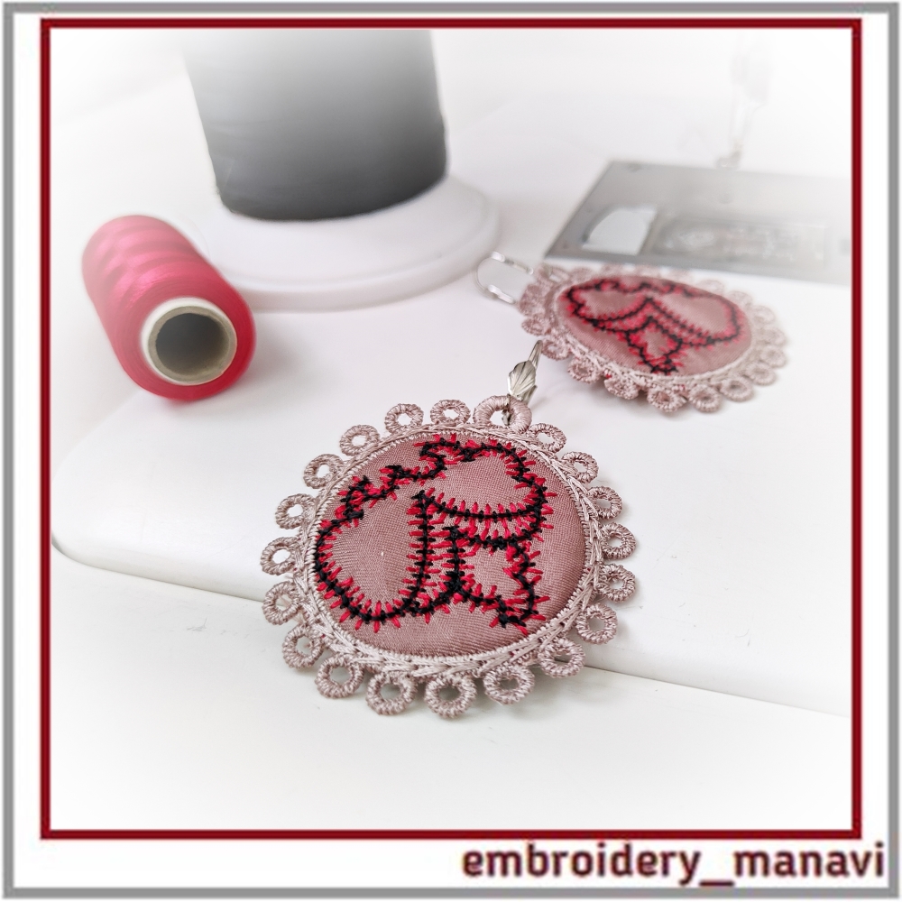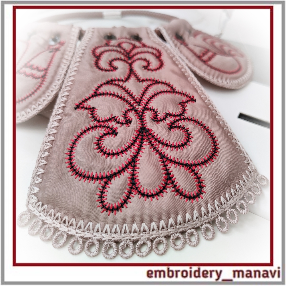 👉In The Hoop Digital machine embroidery design for a folk-style chest ornament and earrings with floral quilting and FSL edge finish. Fits 5.51 x 7.87 hoops. Ideal for accessories, costumes, and textile art. Instant download.