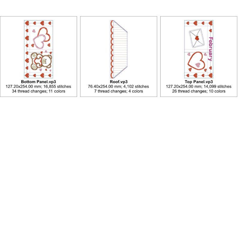 This adorable February themed ITH house mini quilt is made in 3 hoopings. Each panel is made in the hoop. The panels and final completion is done using a sewing machine. The borders are added in the hoop. The envelope, hearts and teddybear are all done in applique. This cute hanger is quick and easy to make and perfect for a Valentine or heart themed dÃcor. The approx. finished size excluding loops: 13.5" x 10" Hoops: Done for 6x10