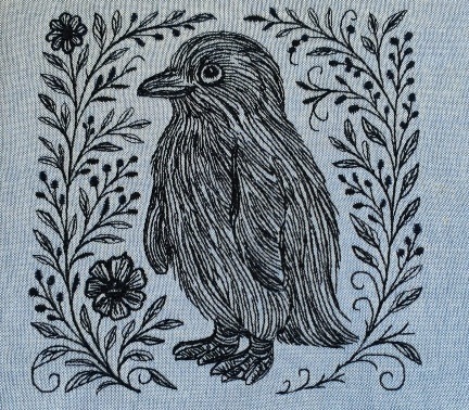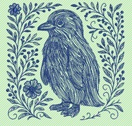 Pebble-Waddle Penguin is a sweet penguin line embroidery design, standing proudly within a frame of curling leaves, berries, and delicate blooms. With its rounded form and softly textured linework, this penguin feels endearingly thoughtful rather than formal, making it perfect for hoop art, cushions, wall panels, or feature sections on bags. The layered linework creates gentle depth and movement, giving this little penguin a calm, storybook charm.