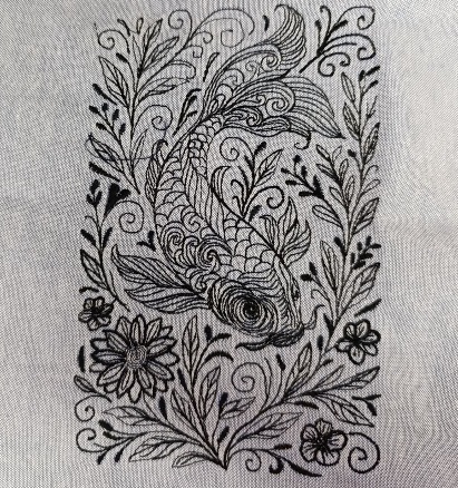 Graceful and flowing, River Whispers captures the elegance of a koi gliding through swirling currents of floral flourish. The fine line embroidery brings movement and depth, making it perfect for hoop art, tote bags, or cushion covers. Stunning in solid threads, and truly mesmerizing when stitched in variegated shades to echo the shimmer of water.