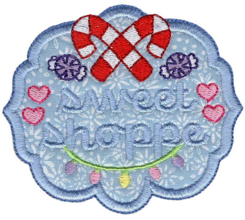 Christmas, children, sweet shop, sweet shoppe, sweet, shop, shoppe, applique, kitchen, Christmas kitchen, candy, Christmas Candy, Christmas cake, cake, decorated cake, cake ornament, coated ornament, ornament, cotton candy, cupcake, Christmas cupcake, lollipop, lollipop trio, trio of lollipops, peppermint, peppermint lollipop, peppermint popsicle, popsicle, ribbon candy, sundae, Christmas sundae, swirl lollipop, Christmas Tree, Christmas Tree lollipop