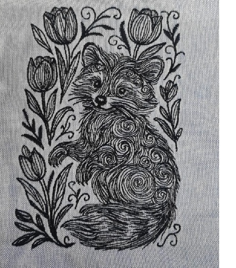 This line embroidery design features the Tulip Bandit, a mischievous raccoon caught red-pawed among blooming tulips. With his swirly fur and cheeky grin, he brings woodland whimsy and a dash of mischief to your stitching. Perfect for hoop art, cushions, totes, or playful dÃcor he's a little rogue who steals hearts (and maybe a flower or two).