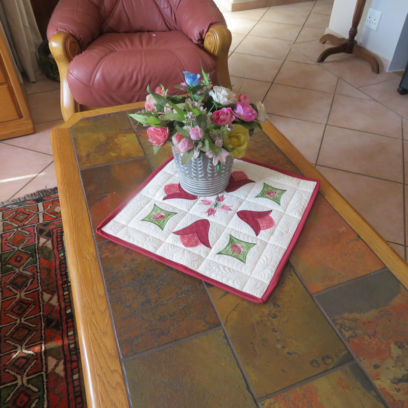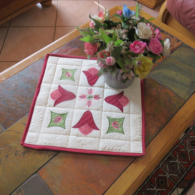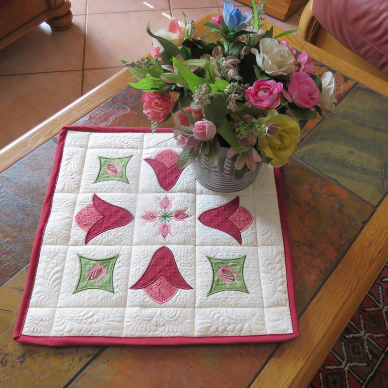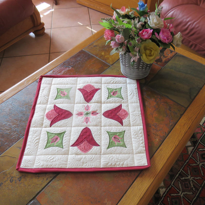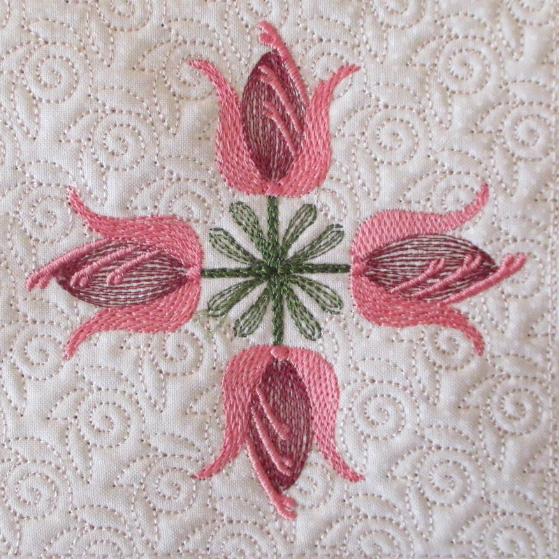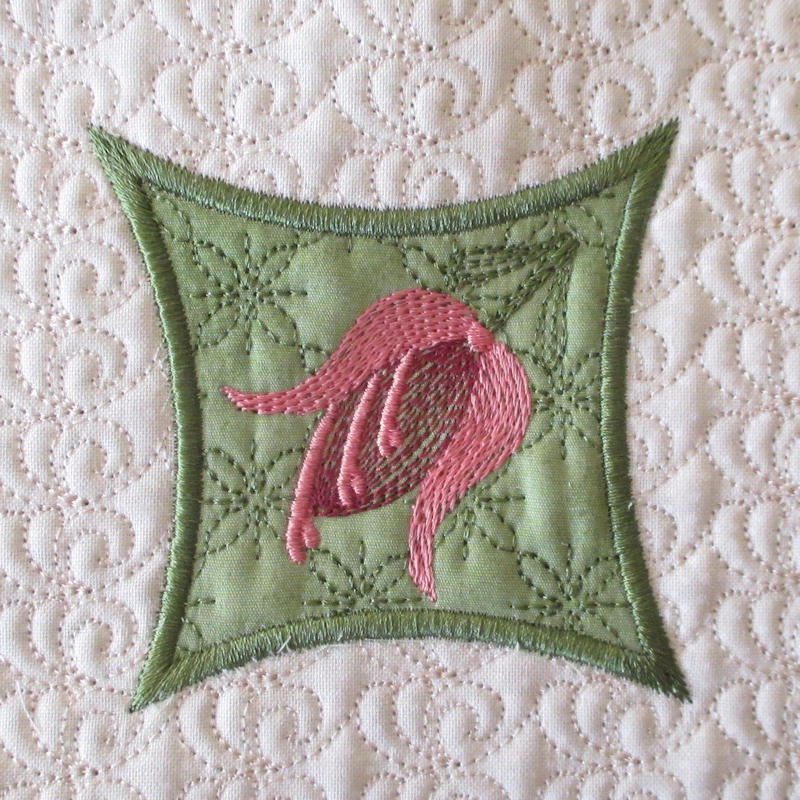 Stitch these blocks together to form a big block for cushions quilts and runners. It will also look beautiful as a handbag. You can stitch the Tulip blocks with or without the outside border. For your convenience I included combination blocks of the border.