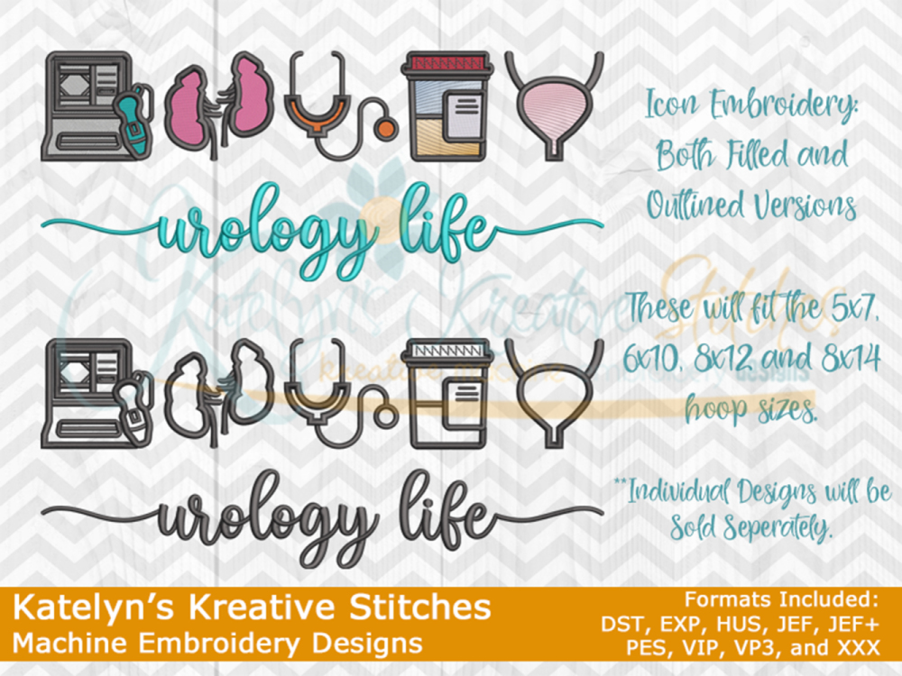Our Urology Life icon embroidery designs will come in two versions. One will be a multi colored fill stitch and the other will be a single colored satin outline. These designs will fit the 5x7, 6x10, 8x12 and 8x14 hoop sizes. It "does not" include the 4x4 size.