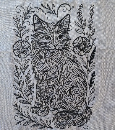 Finished size 4.70"W x 7"H Frame Size 5x7 Stitch count: 20 899 Formats Included: JEF, EXP, PES, PEC, VIP, VP3, HUS, SHV, DST, XXX Playful yet majestic, Whisker Whirl captures a feline lounging in a storm of swirling fur and floral flourishes. The detailed line embroidery makes this design purrfect for hoop art, totes, and cushions a statement piece with stitched sass. Add variegated threads for a magical shimmer that brings the whiskers to life.