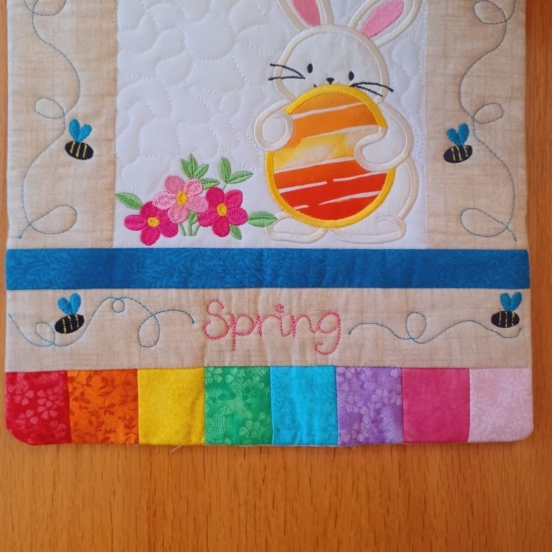 This super cute April Mini Quilt is made using applique and the sew and flip technique. Each panel is made entirely in the hoop. The panels are joined and the mini quilt is completed using a sewing machine.
