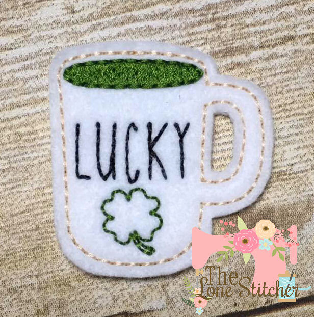 feltie, in the hoop, mini, girls, boys, St. Patrick's Day, holidays, kitchen, mug, cup, drinks, coffee, words and phrases, shamrock, clover
