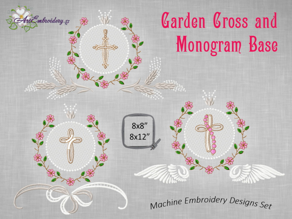 Garden Cross and Monogram Base Machine Embroidery Designs Pack for hoops 8x8" or 8x12.