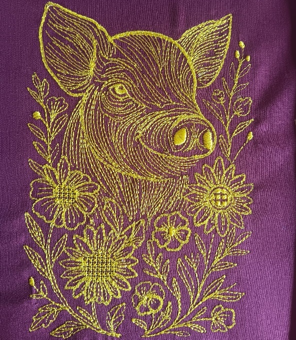Finished size 4.15"W x 6"H Frame size 6x6 Stitch count: 20 560 Formats Included: JEF, EXP, PES, PEC, VIP, VP3, HUS, SHV, DST This charming piglet peeks through a meadow of stitched blossoms, radiating warmth and curiosity. A playful yet elegant line embroidery design that shines on totes, aprons, or farmhouse dÃcor especially magical in variegated threads.