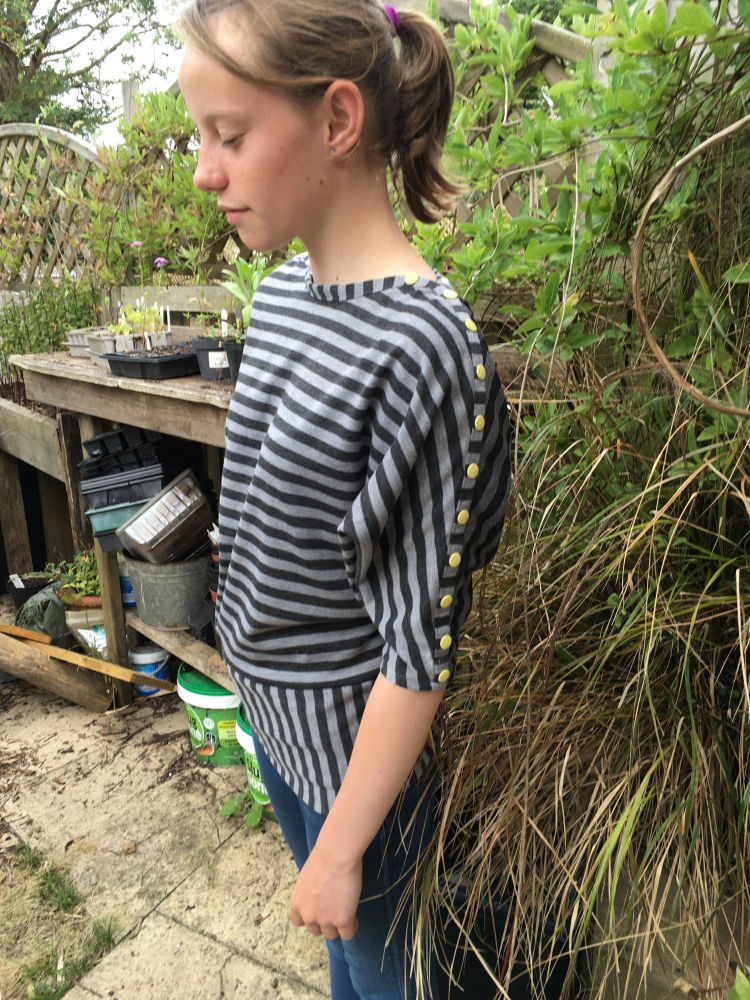 The Lulu Tee is a raglan/bat-wing style tee-shirt in cup sizes A - G. Featuring a high, wide neckline, binding along the arms and neckline, and buttons or snaps fastening the shoulder seams. The raglan style is more fitted through the bust and arms, while the bat-wing style is looser and has an optional waistband.